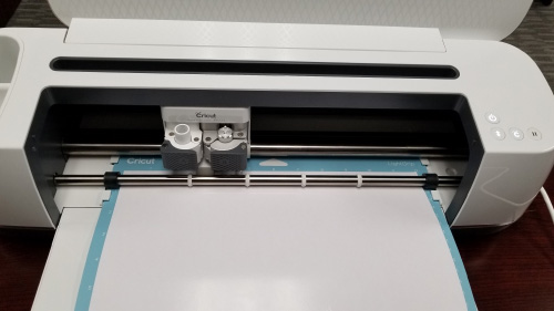 - Once the cutting mat in loaded into the machine, you will see another blinking light on the machine indicating that the machine is ready to cut the vinyl. Click this to begin the cutting process!