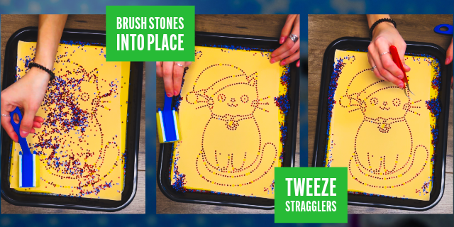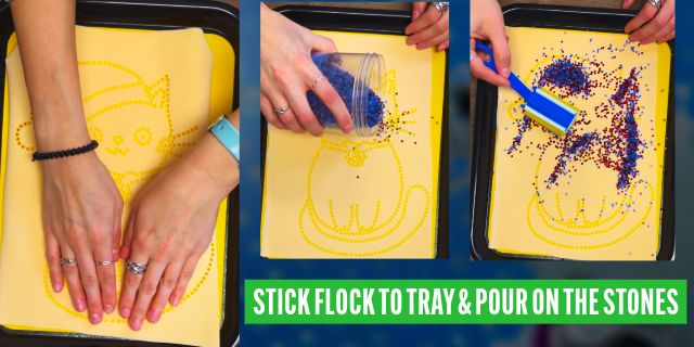 3. Peel your flock material off the liner, and stick it down on the rhinestone tray. Pour your rhinestones onto the template and gently brush them into the holes — they should fall in shiny side up!